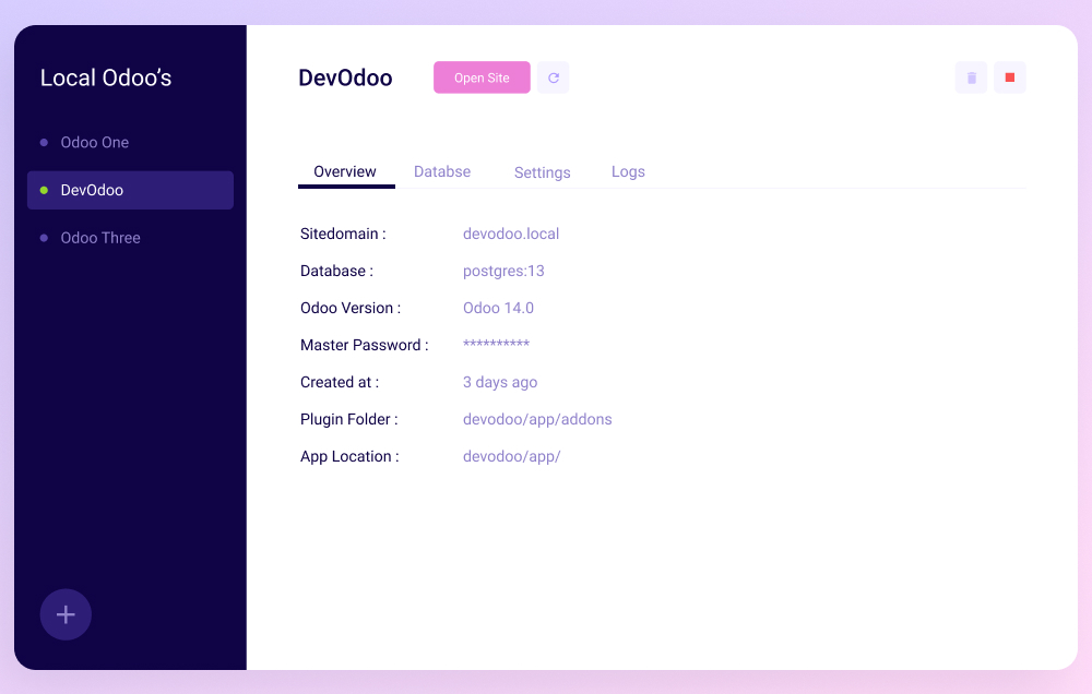 DevOdoo makes local Odoo and development quick and easy. Using Docker repository or you can use your own with a single click. Take advantage to develop themes, addons, all on your local machine.